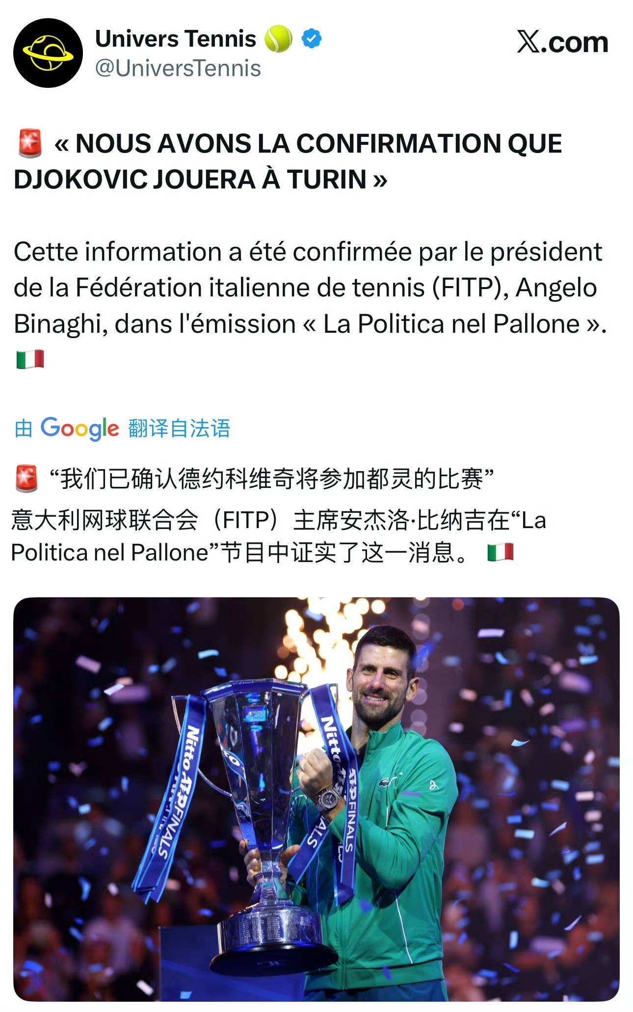 然而,赛场外的另一则消息却为德约科维奇的后续行程增添了一丝悬念。雅典站开赛前,意大利网协主席比纳吉在接受采访时 确认,德约科维奇今年将重返都灵,参加年终总决赛的角逐。