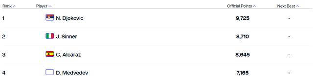 截至4月8日最新排名,小德以9,725分稳坐榜首,领先第二位的辛纳和第三位的阿尔卡拉斯1000多分。他同时也成为了男单世界第一中历史上年龄最长的选手。